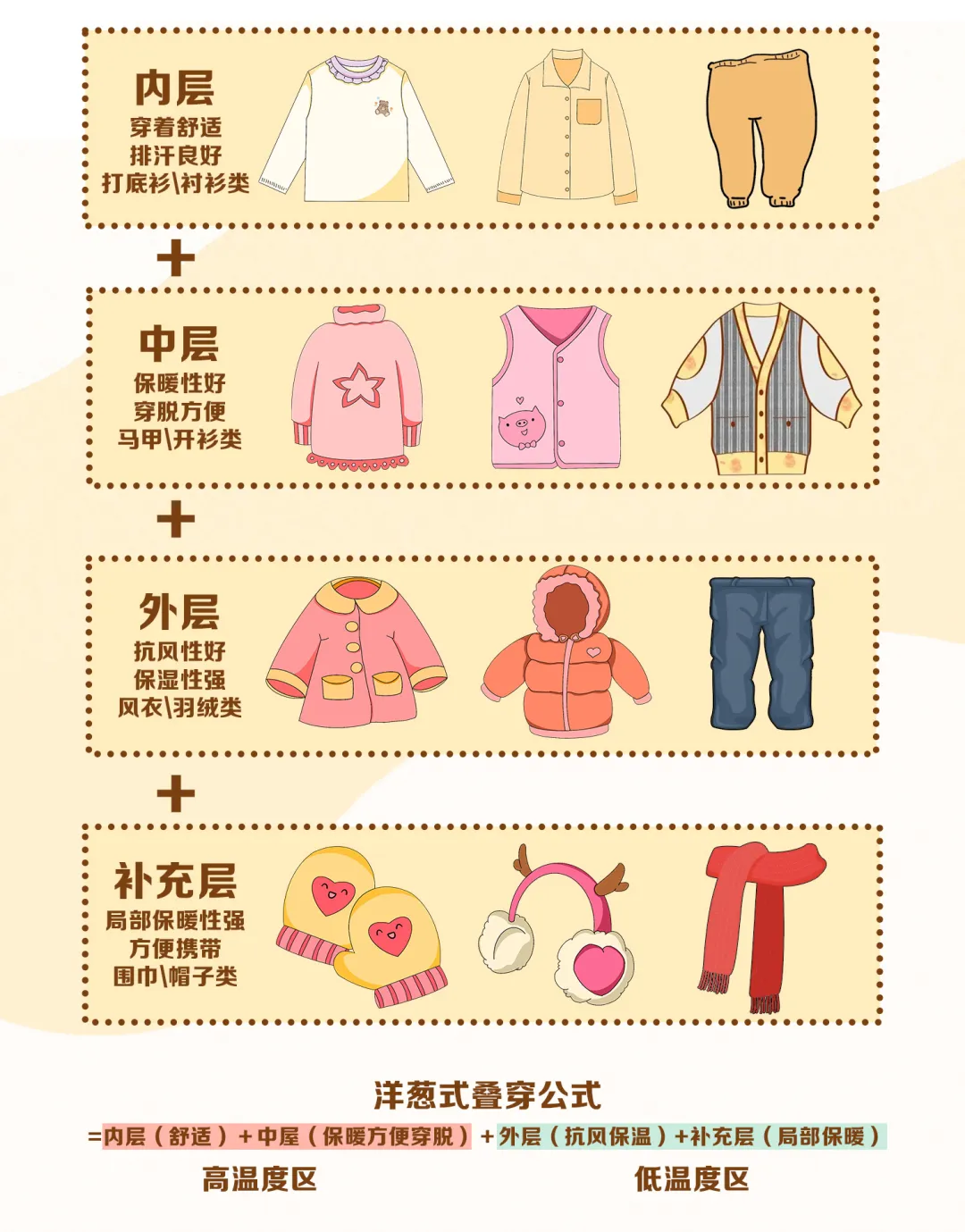 穿衣可参考下面的 “洋葱式穿衣法”,内层选择柔软、透气的棉质衣物,中间选择保暖性好的,外层选择防风材质的,避免过度包裹,以免宝宝出汗后受凉。