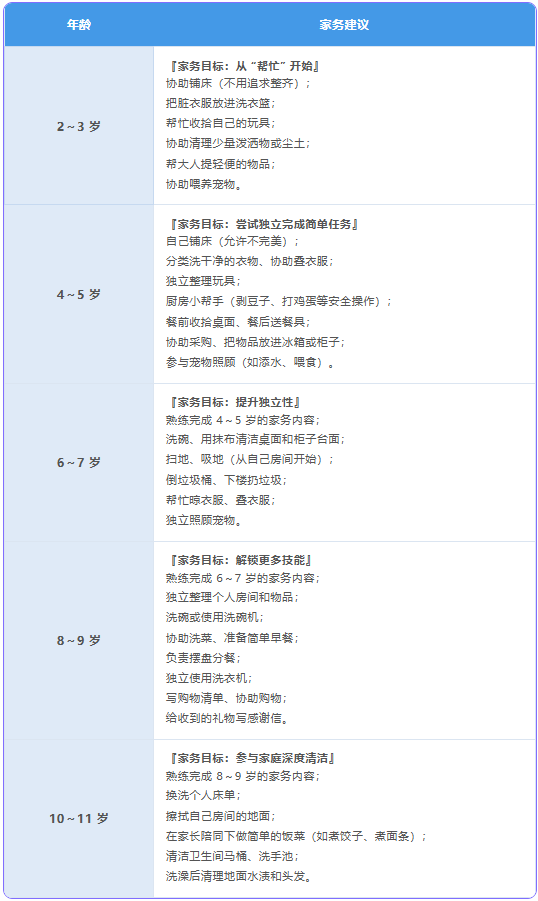结合美国和澳洲心理行为健康组织的建议,为家长们整理了这份『分龄家务清单』,大家可以根据孩子的实际情况灵活调整:
