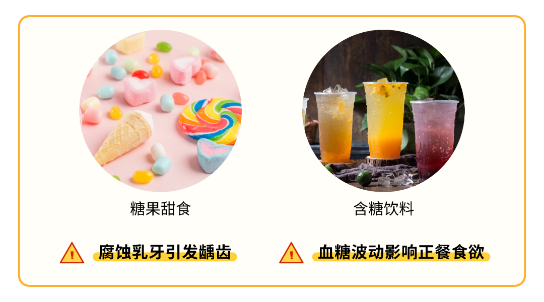 糖果、巧克力、蜜饯、碳酸饮料、高糖乳酸菌饮品等,过量摄入会让宝宝血糖波动,出现烦躁、嗜睡,还会腐蚀乳牙引发龋齿,加重肠胃负担导致积食,更会影响正餐食欲,造成营养摄入不均衡。